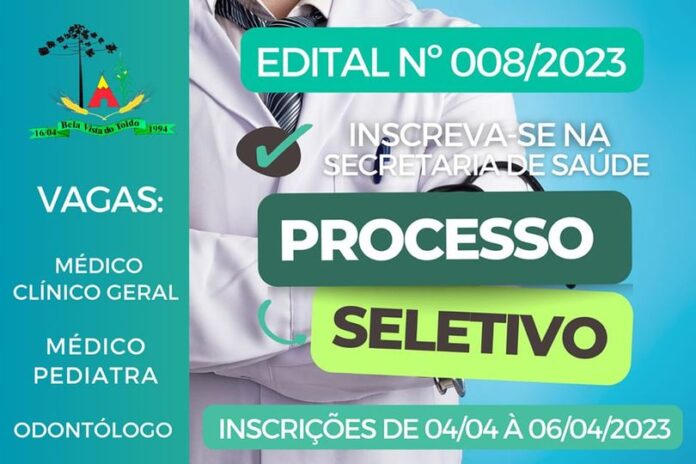A Prefeitura de Bela Vista do Toldo lançou nessa Sexta-feira (31), o Edital nº 008/2023 de processo seletivo para contratação temporária de profissionais do cargo de Médico Clínico Geral, Médico Pediatra e Odontólogo.